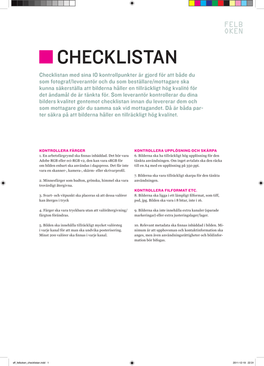 Checklistan med sina 10 kontrollpunkter är gjord för att både du som fotograf/leverantör och du som beställare/mottagare ska kunna säkerställa att bilderna håller en tillräckligt hög kvalité för det ändamål de är tänkta för.